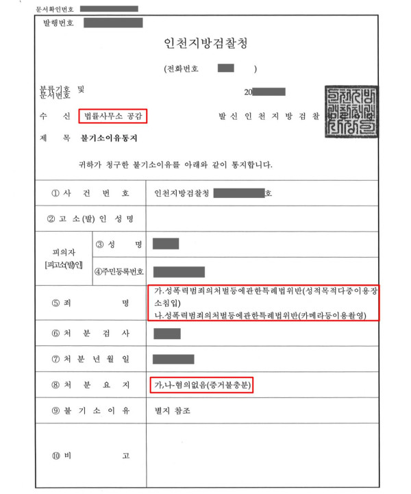 다행히 법률사무소 공감의 형사전문변호사의 적극적인 변호로 의뢰인은 카촬죄와 여자화장실 침입(성적목적다중이용장소침입)에 대해 무혐의 처분을 받았습니다.