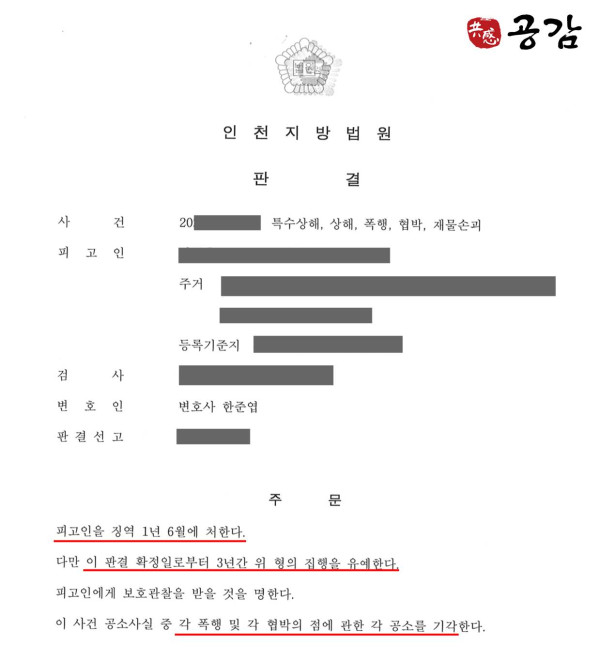 다행히 피의자는 재판에서 징역 1년 6개월에 집행유예 3년을 받아서 교도소 복역은 피해갈 수 있었습니다.
