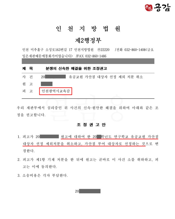 하지만 1년 후 안내받은 인천광역시교육감의 승진가산점 대상자 명단에는 의뢰인의 이름이 제외되어 있었습니다.