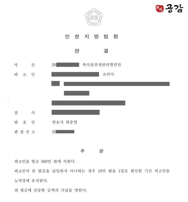 또한 이와는 별개로 공감의 변호사는 의뢰인에게 지금이라도 축산물 영업을 신고하고, 위생교육도 이수받을 것을 권유하였고, 의뢰인은 이를 이행하였습니다.