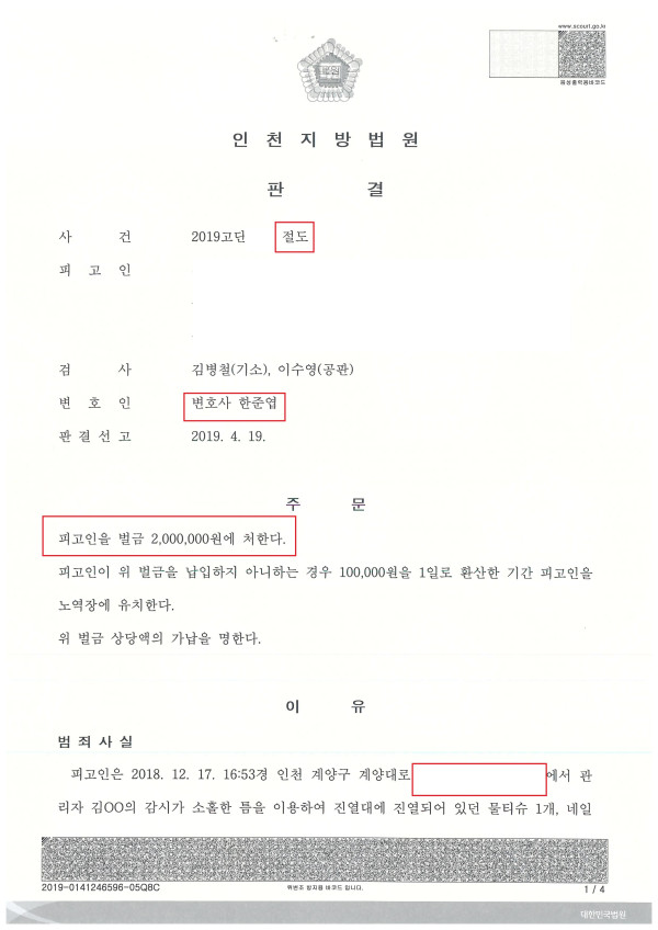검사는 의뢰인에게 징역 6월의 실형을 구하였으나, 법률사무소 공감의 형사전문변호사들은 의뢰인의 어려운 사정, 합의가 된 점 등을 강력히 변론하여 벌금 200만 원의 경미한 형을 선고 받을 수 있었습니다.