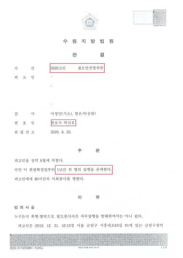 [형사소송] 기차역 역무원을 폭행한 사건에서 집행유예를 선고받은 사례