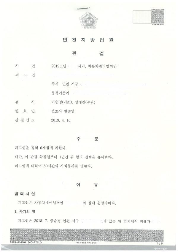 [형사소송] 사기죄, 자동차관리법 위반 사건-집행유예 선고