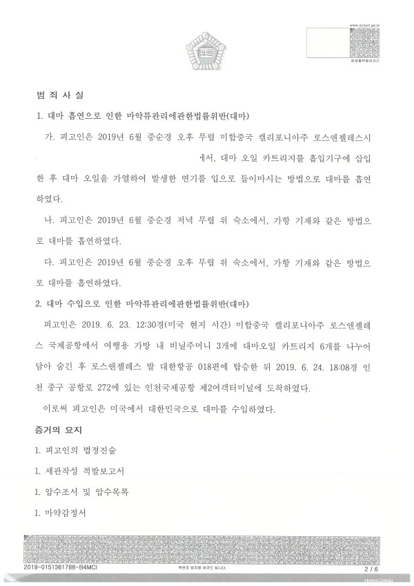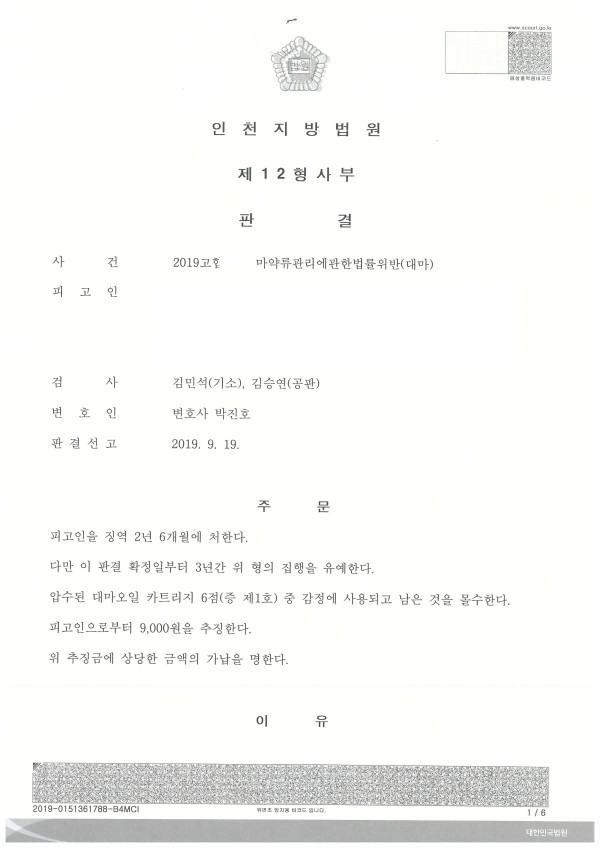 [형사소송] 대마카트리지를 밀반입한 사건- 집행유예선고