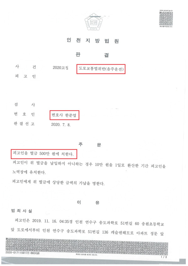 [형사소송] 음주운전 사건에서 벌금형을 선고 받은 사례