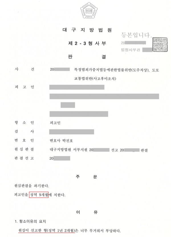 그럼에도 정말 다행히도 항소심에서 주장한 공감의 형사전문변호사의 주장이 받아들여져,