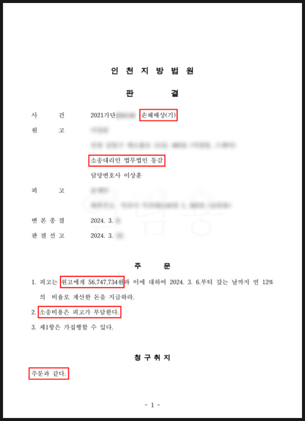 물론 변호사 선임비 등의 소송비용도 상대방이 전부 배상하는 것으로 판결문에 명시되었습니다.